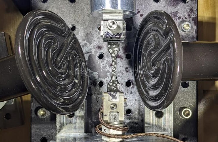 Figure 4. This experimental setup features a tensile test of the lithium (center, black with silver dots) between two black ceramic heaters.